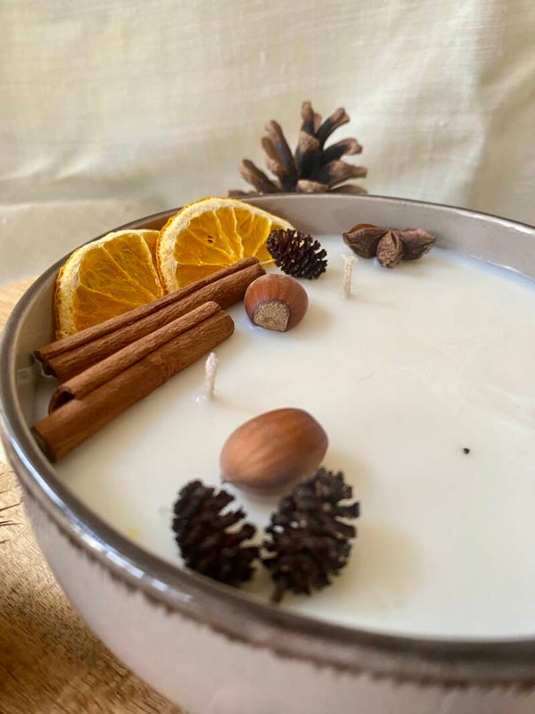 Chaque bougie est décorée de détails naturels (tranches d’orange séchée, épices…) pour une touche chic et automnale.